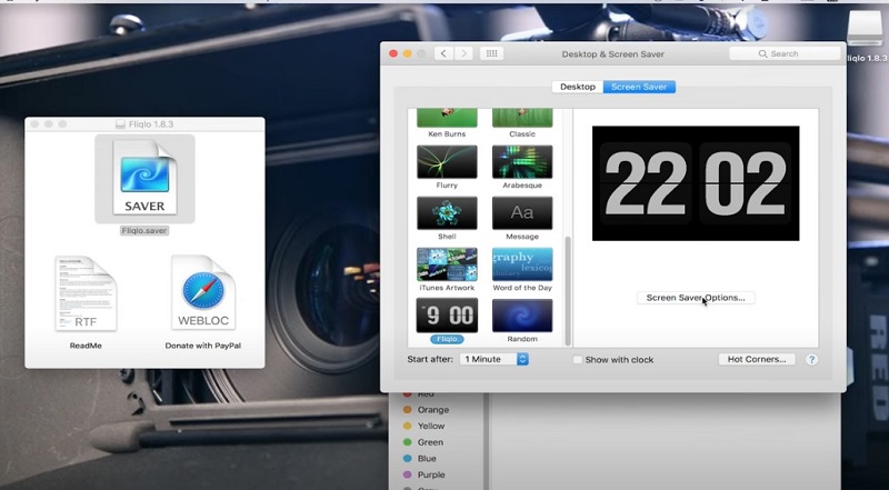 Bước 4: Chọn vào Tab Trình bảo vệ màn hình ( Desktop & Screen Saver) rồi sau đó bấm chọn vào Fliqlo.